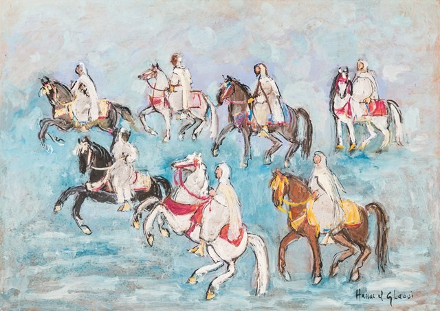 Hassan el Glaoui est né en 1923 à Marrakech. Il vit et travaille à Rabat. Il doit sa carrière de peintre au très influent Premier Ministre britannique sir Winston Churchill qui passa de nombreux séjours à Marrakech auprès du Pacha et qui insista pour qu’il autorise son fils Hassan à peindre. Hassan El Glaoui est alors envoyé en France, à la fin des années 40, pour étudier la peinture à Paris, auprès des grands peintres de l’époque. Sa première exposition personnelle a lieu en 1950 à Paris, suivie par celle de new York en 1952. En 1957, il participe à la 2ème Biennale d’Alexandrie et en 1963 à l’exposition «Deux mille ans d’art au Maroc», à la galerie Charpentier à Paris. Très connu par les chevaux qu’il représente, notamment dans des fantasias, l’artiste peint avec finesse les selles couvertes de velours, les burnous dans un mouvement d’envol, les fusils damasquinés... Il décrit et raconte des scènes qu’il a vues et vécues et fait ainsi référence à la mémoire, à l’histoire et au patrimoine artistique. Hassan El Glaoui n’a pas seulement sublimé la thématique du cheval et de son cavalier, il s’est consacré également au portrait et à la nature morte. PRINCIPALES EXPOSITIONS INDIVIDUELLES 2010 « rétrospective 60 ans de peinture », Attijariwafa Bank, Casablanca 2009 « Pacha de l’art », rempart Galerie, Marrakech 2005 Matisse art Gallery, Marrakech 1993 Exposition dans la Maison de la Presse, Londres, G.B. 76-04 Hammer Galleries, New York, Etats-Unis 1976 Galerie Venise cadre, Casablanca 1975 Galerie V, Paris, France 1973 Vernissage à l’hôtel de la Tour Hassan, Rabat 70-73 Le savouroux, Casablanca 1969 Galerie Isy Brachot, Bruxelles, Belgique Tryon Galleries, Londres, G.B. Vernissage à l’hôtel de la Tour Hassan, Rabat Centre Culturel International, Hammamet, Tunisie 1968 Upper Grosvenor Galleries, Londres, G.B. 1967 Hammer Galleries, New York, Etats-Unis 1965 Galerie Pierre carrez, Paris, France 1964 Galerie Jean Berthier, Marseille, France Vernissage à l’hôtel El Mansour, Casablanca 1963 Galerie Jeanne castel, Paris, France 59-63 Galerie Petrides, Paris, France 1951 Wildenstein Gallery, New York, Etats-Unis 1950 Galerie André Weil, Paris, France PRINCIPALES EXPOSITIONS COLLECTIVES 2012 « Meeting in Marrakesh : Painting of Hassan el Glaoui and Winston Churchill », Leighton house Museum, Londres, G.B. 2009 Biennale de Marrakech 2007 « Estampes-création plurielle », Galerie de l’Institut Français, Rabat 2004 Célébration de l’art Marocain, Eglise du Sacré-Coeur, Casablanca 1999 Matisse art Gallery, Marrakech 98-97 Musée de Marrakech 1988 « 29 peintres du Maroc » centre nationale de la culture, Le Caire, Egypte 1987 Exposition Internationale, Bagdad, Irak 1966 Festival Mondial des arts nègres, Dakar, Sénégal 1963 « Deux milles ans d’art au Maroc », galerie Charpentier, Paris, France Rencontre internationale des artistes au Musée des Oudayas