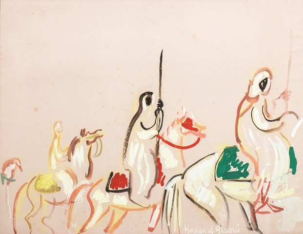 Hassan el Glaoui est né en 1923 à Marrakech. Il vit et travaille à Rabat. Il doit sa carrière de peintre au très influent Premier Ministre britannique sir Winston Churchill qui passa de nombreux séjours à Marrakech auprès du Pacha et qui insista pour qu’il autorise son fils Hassan à peindre. Hassan El Glaoui est alors envoyé en France, à la fin des années 40, pour étudier la peinture à Paris, auprès des grands peintres de l’époque. Sa première exposition personnelle a lieu en 1950 à Paris, suivie par celle de new York en 1952. En 1957, il participe à la 2ème Biennale d’Alexandrie et en 1963 à l’exposition «Deux mille ans d’art au Maroc», à la galerie Charpentier à Paris. Très connu par les chevaux qu’il représente, notamment dans des fantasias, l’artiste peint avec finesse les selles couvertes de velours, les burnous dans un mouvement d’envol, les fusils damasquinés... Il décrit et raconte des scènes qu’il a vues et vécues et fait ainsi référence à la mémoire, à l’histoire et au patrimoine artistique. Hassan El Glaoui n’a pas seulement sublimé la thématique du cheval et de son cavalier, il s’est consacré également au portrait et à la nature morte. PRINCIPALES EXPOSITIONS INDIVIDUELLES 2010 « rétrospective 60 ans de peinture », Attijariwafa Bank, Casablanca 2009 « Pacha de l’art », rempart Galerie, Marrakech 2005 Matisse art Gallery, Marrakech 1993 Exposition dans la Maison de la Presse, Londres, G.B. 76-04 Hammer Galleries, New York, Etats-Unis 1976 Galerie Venise cadre, Casablanca 1975 Galerie V, Paris, France 1973 Vernissage à l’hôtel de la Tour Hassan, Rabat 70-73 Le savouroux, Casablanca 1969 Galerie Isy Brachot, Bruxelles, Belgique Tryon Galleries, Londres, G.B. Vernissage à l’hôtel de la Tour Hassan, Rabat Centre Culturel International, Hammamet, Tunisie 1968 Upper Grosvenor Galleries, Londres, G.B. 1967 Hammer Galleries, New York, Etats-Unis 1965 Galerie Pierre carrez, Paris, France 1964 Galerie Jean Berthier, Marseille, France Vernissage à l’hôtel El Mansour, Casablanca 1963 Galerie Jeanne castel, Paris, France 59-63 Galerie Petrides, Paris, France 1951 Wildenstein Gallery, New York, Etats-Unis 1950 Galerie André Weil, Paris, France PRINCIPALES EXPOSITIONS COLLECTIVES 2012 « Meeting in Marrakesh : Painting of Hassan el Glaoui and Winston Churchill », Leighton house Museum, Londres, G.B. 2009 Biennale de Marrakech 2007 « Estampes-création plurielle », Galerie de l’Institut Français, Rabat 2004 Célébration de l’art Marocain, Eglise du Sacré-Coeur, Casablanca 1999 Matisse art Gallery, Marrakech 98-97 Musée de Marrakech 1988 « 29 peintres du Maroc » centre nationale de la culture, Le Caire, Egypte 1987 Exposition Internationale, Bagdad, Irak 1966 Festival Mondial des arts nègres, Dakar, Sénégal 1963 « Deux milles ans d’art au Maroc », galerie Charpentier, Paris, France Rencontre internationale des artistes au Musée des Oudayas
